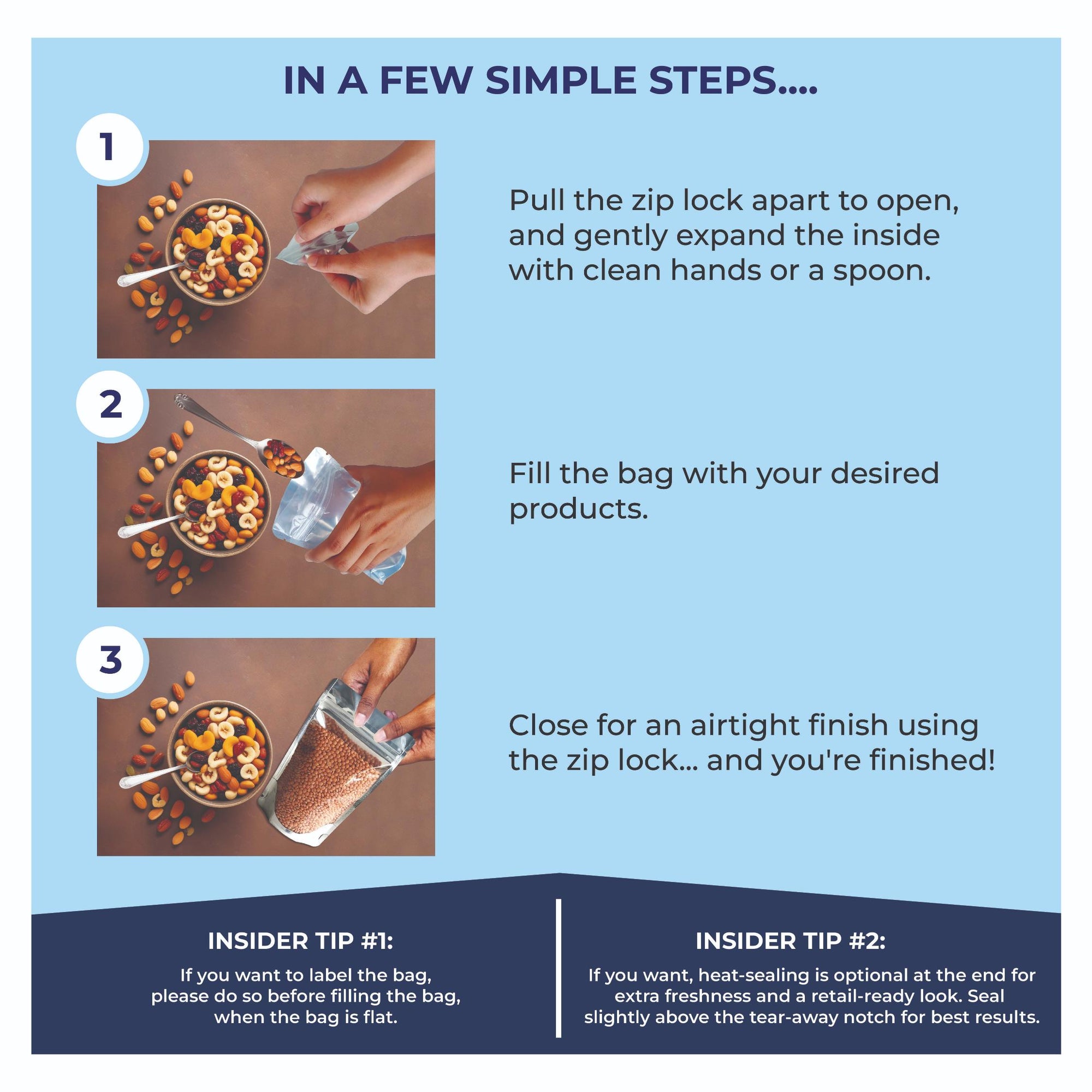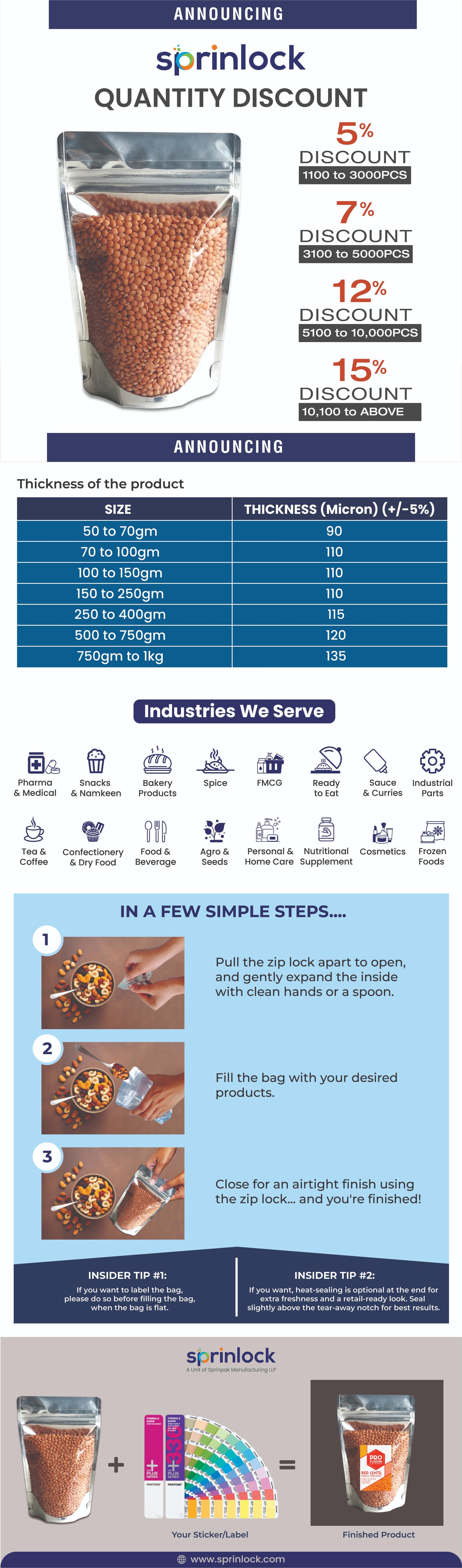 - Comes with Rounded Corners, Resealable zipper and Tear notch to tear the pouch easily making it a perfect packaging and perfect for food and non-food items.