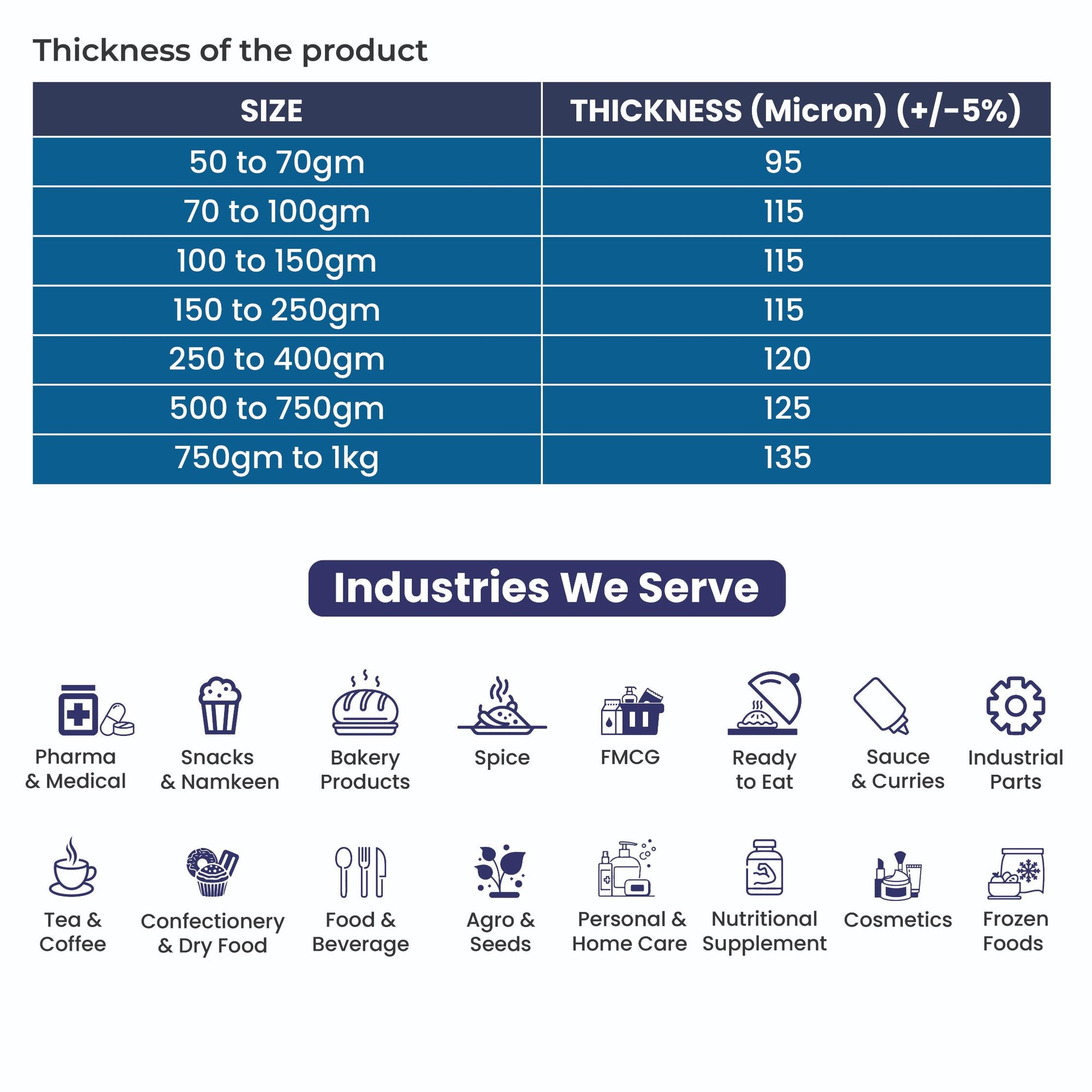 - These plastic pouches are ideal for packaging food items such as Tea, Coffee, Dry fruits, Snacks, Bakery products, Grocery,Protein powder Non Food items such as Skincare, Seeds, Fertiliser, Pet food.