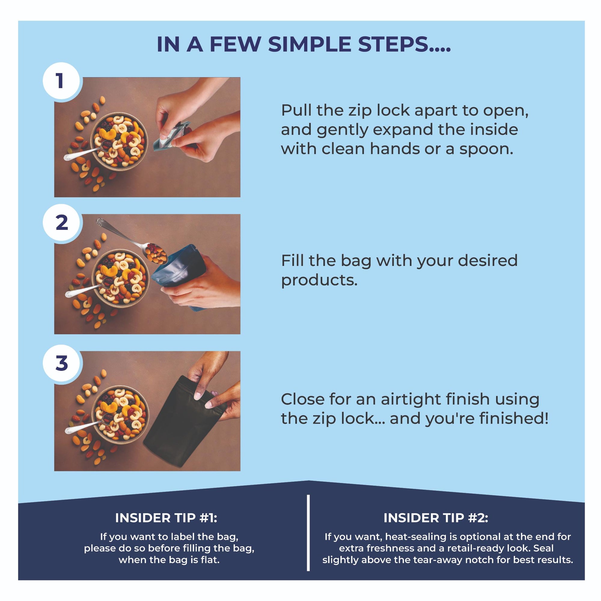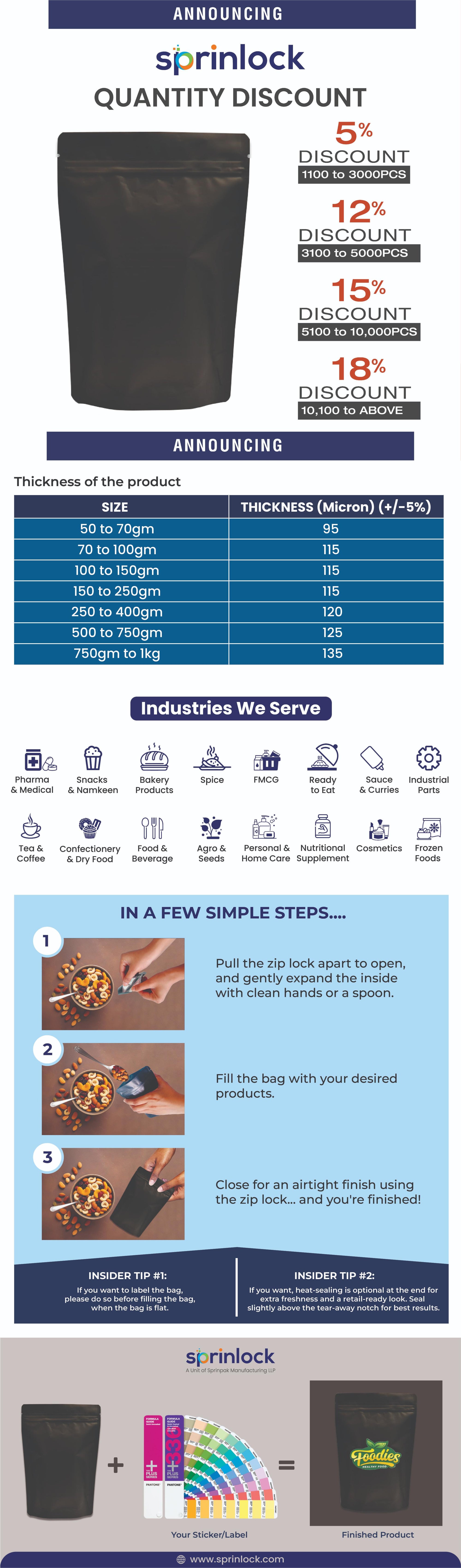 - Our Both side Matte Black Ziplock bags are manufactured using 3 layers(MATTE BOPP-METPET-PE)on both the sides which helps preserve the freshness and contributes to an extended shelf life.